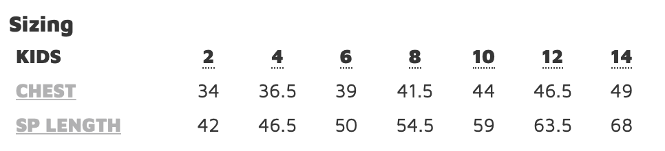 | Chest | 34 | 36.5 | 39 | 41.5 | 44.5 | 47.5 | 50 |
